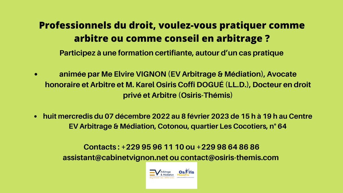 novembre 3, 2022 Elvire VIGNON Professionnels du droit, voulez-vous pratiquer comme arbitre ou comme conseil en arbitrage ? Participez à une formation certifiante, autour d’un cas pratique, animée par : § Me... Lire plus