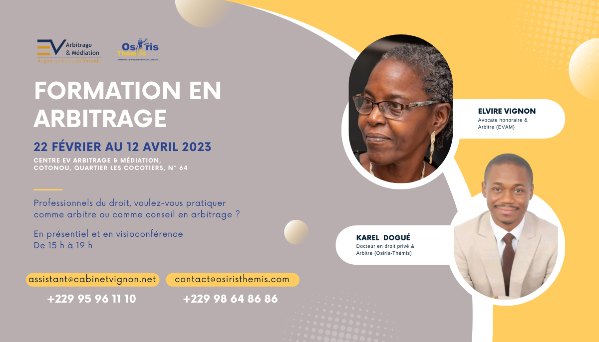 janvier 4, 2023 Elvire VIGNON Professionnels du droit, voulez-vous pratiquer comme arbitre ou comme conseil en arbitrage ? Participez à une formation certifiante, autour d’un cas pratique, animée par : Me Elvire... Lire plus